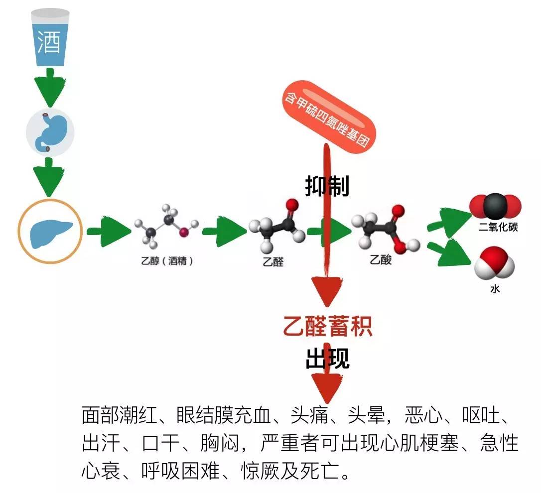 說到吃藥+喝酒要人命,大家比較熟悉的是使用************后喝酒要人命的藥源性雙硫侖樣反應(yīng)!當(dāng)然不是所有的************都會(huì)引起藥源性雙硫侖樣反應(yīng)!一般都是含有甲硫四氮唑基團(tuán)******才會(huì)引起!因其抑制肝臟中的乙醛脫氫酶,導(dǎo)致乙醇的中間代謝產(chǎn)物——乙醛代謝受阻,使血液中乙醛濃度增加而發(fā)生雙硫侖樣反應(yīng)!